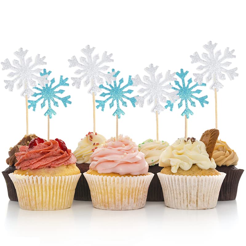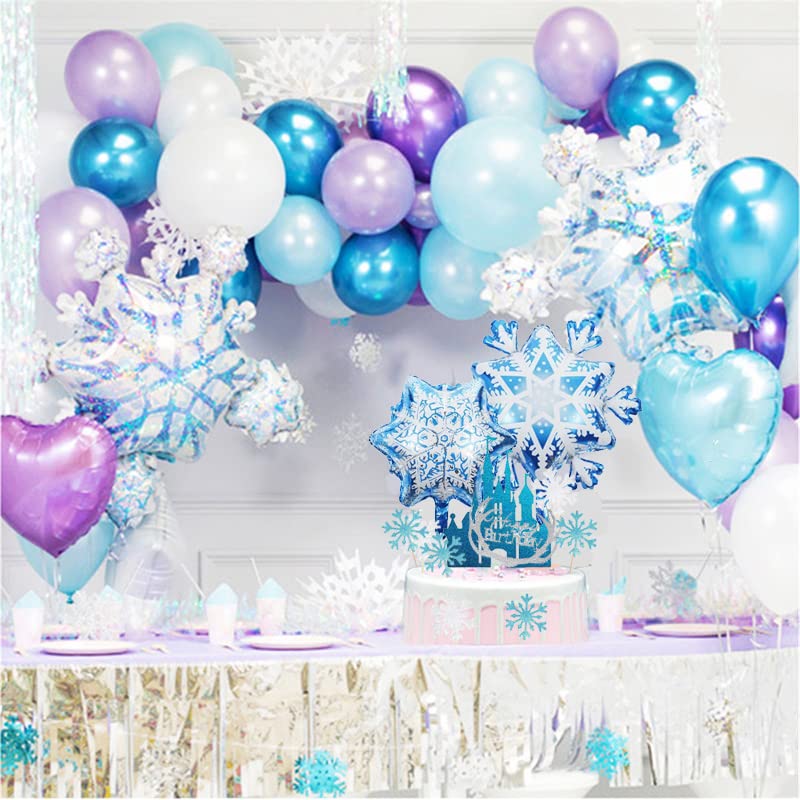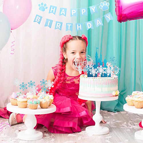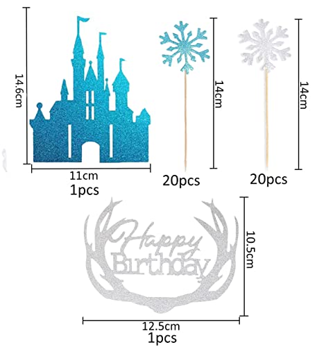 ❄️【42 sneeuwvlokken taartopzetstukken: bevat 1 ijsblauwe glittering Castle taartdecoratie, 1 zilverwitte Happy Birthday taartdecoratie, 20 sneeuwvlokken taarttopper in zilverwitte, 20 blauwe sneeuwvlokken-taartdecoratie.