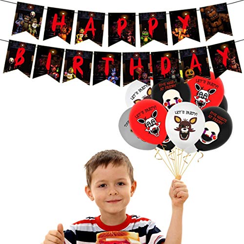 Anjinguang Five Nights at Fre–Ddy’s verjaardagsfeestartikelen set, vijf nachten bij Fre–ddy verjaardagsbanner, ballonnen, taarttopper, vijf nachten bij Freddy themafeestdecoraties voor kinderen